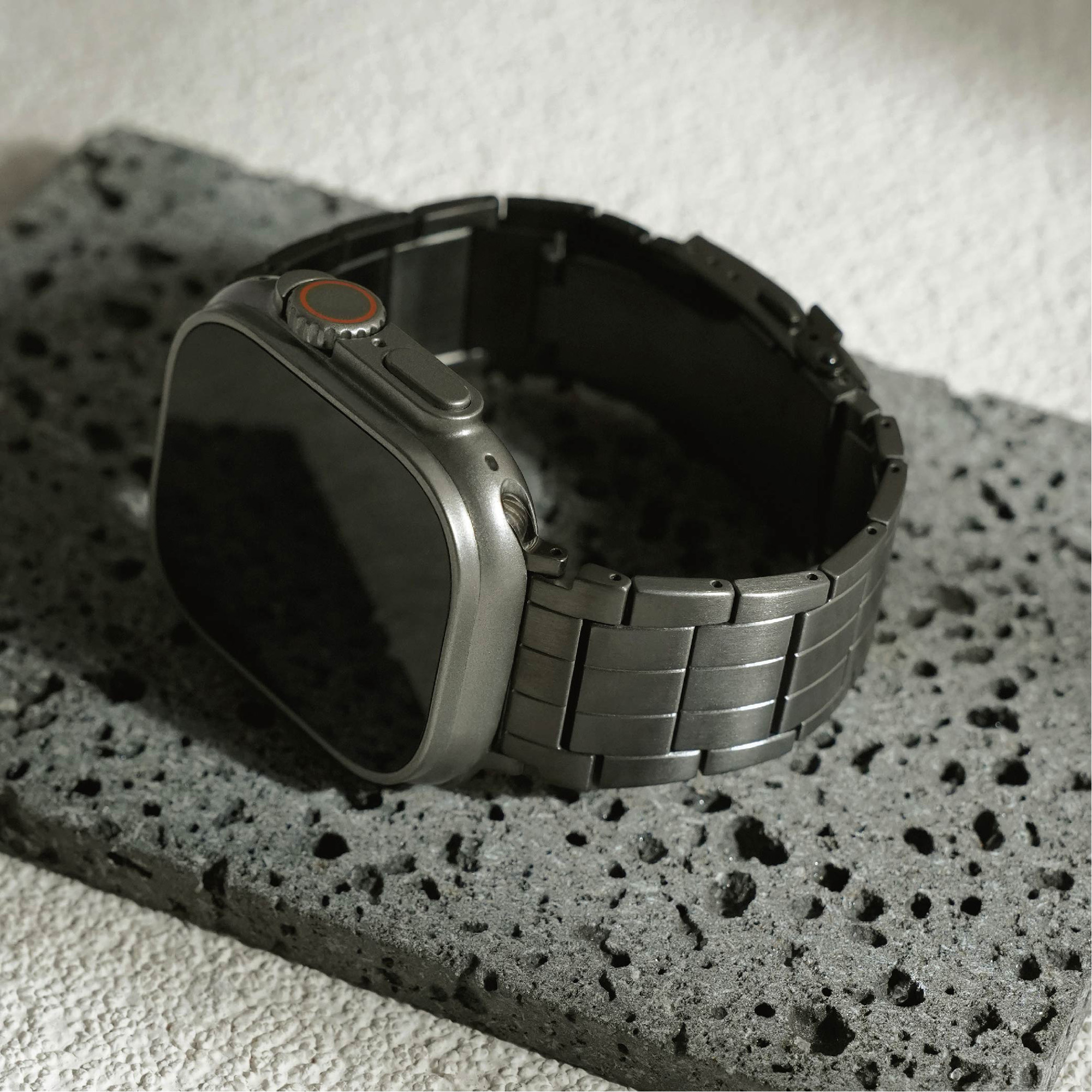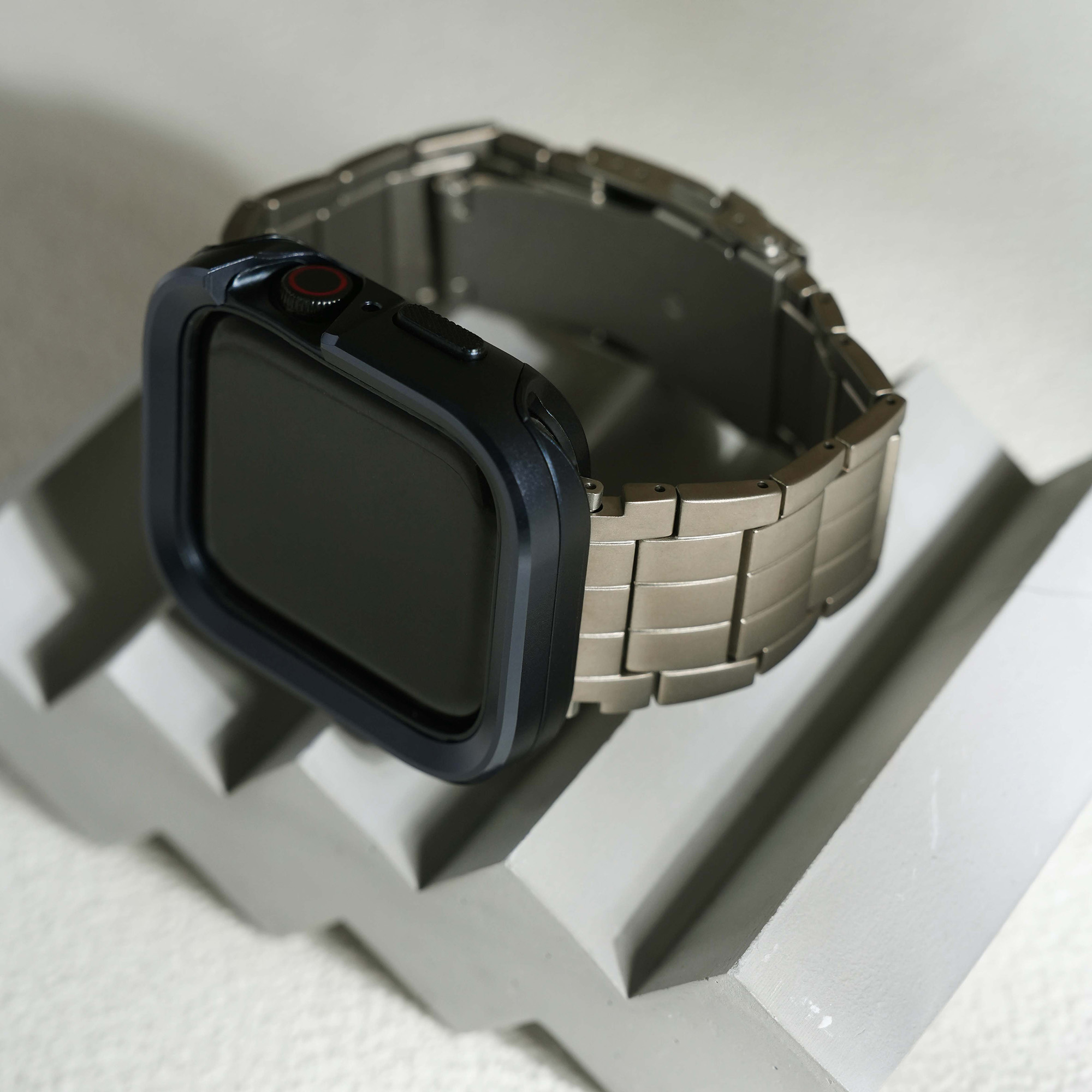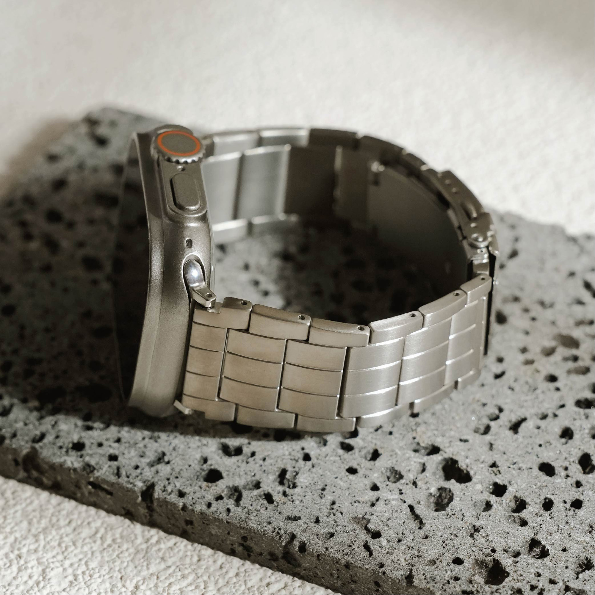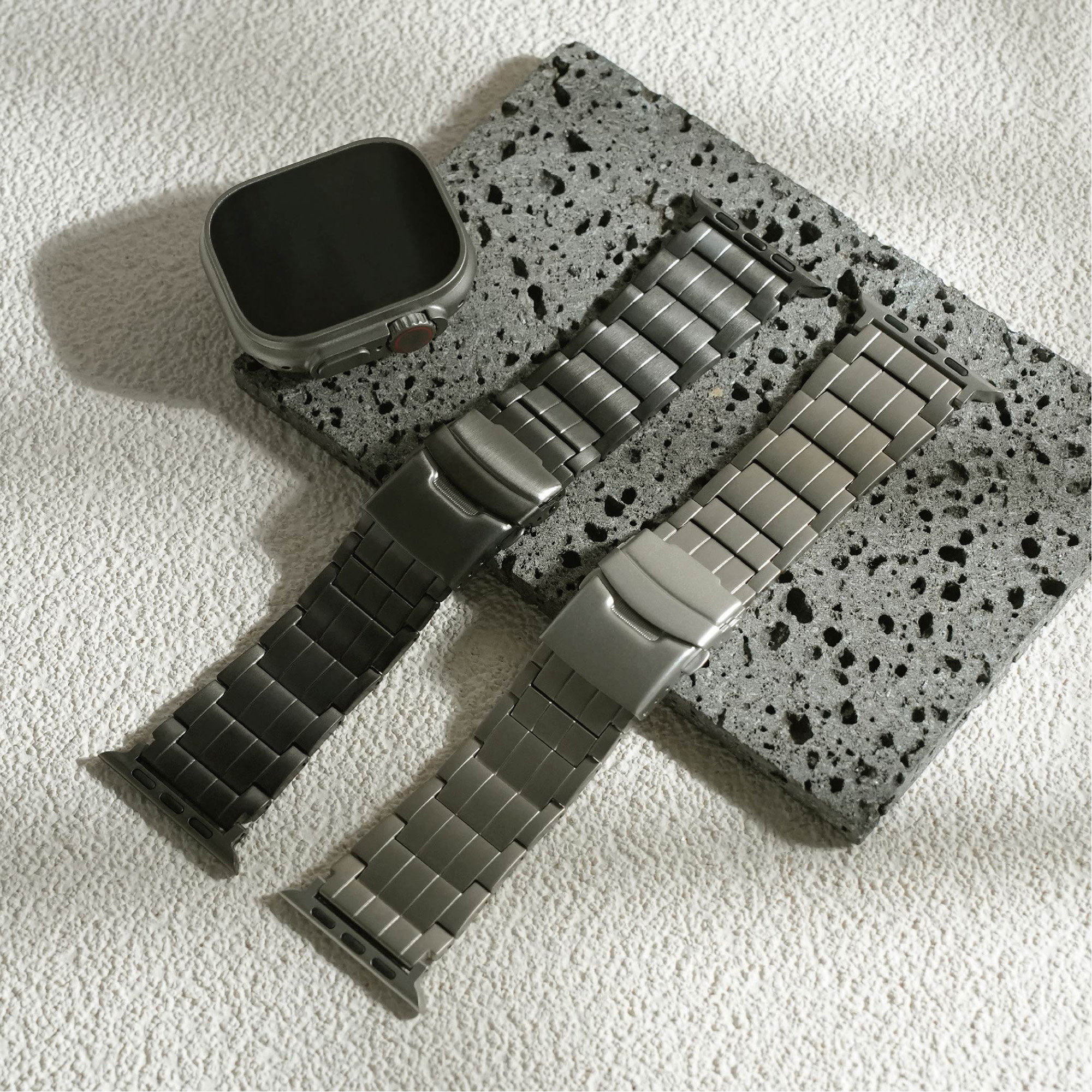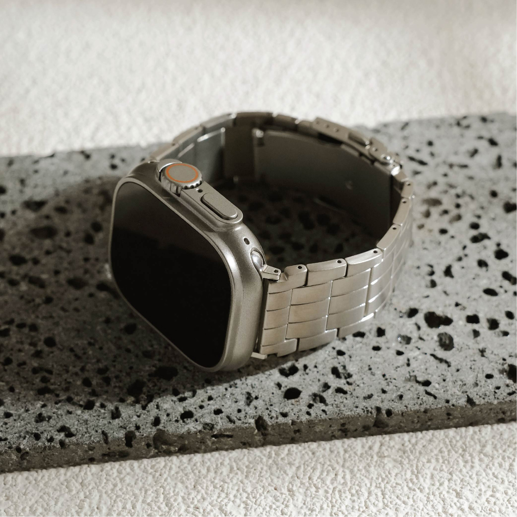 選用高級鈦金屬材質打造,這款錶帶不僅展現俐落硬朗的質感,更兼具輕盈與耐用特性。微霧光澤更增添質感,為你的 Apple Watch 增添奢華與科技兼具的風格。
