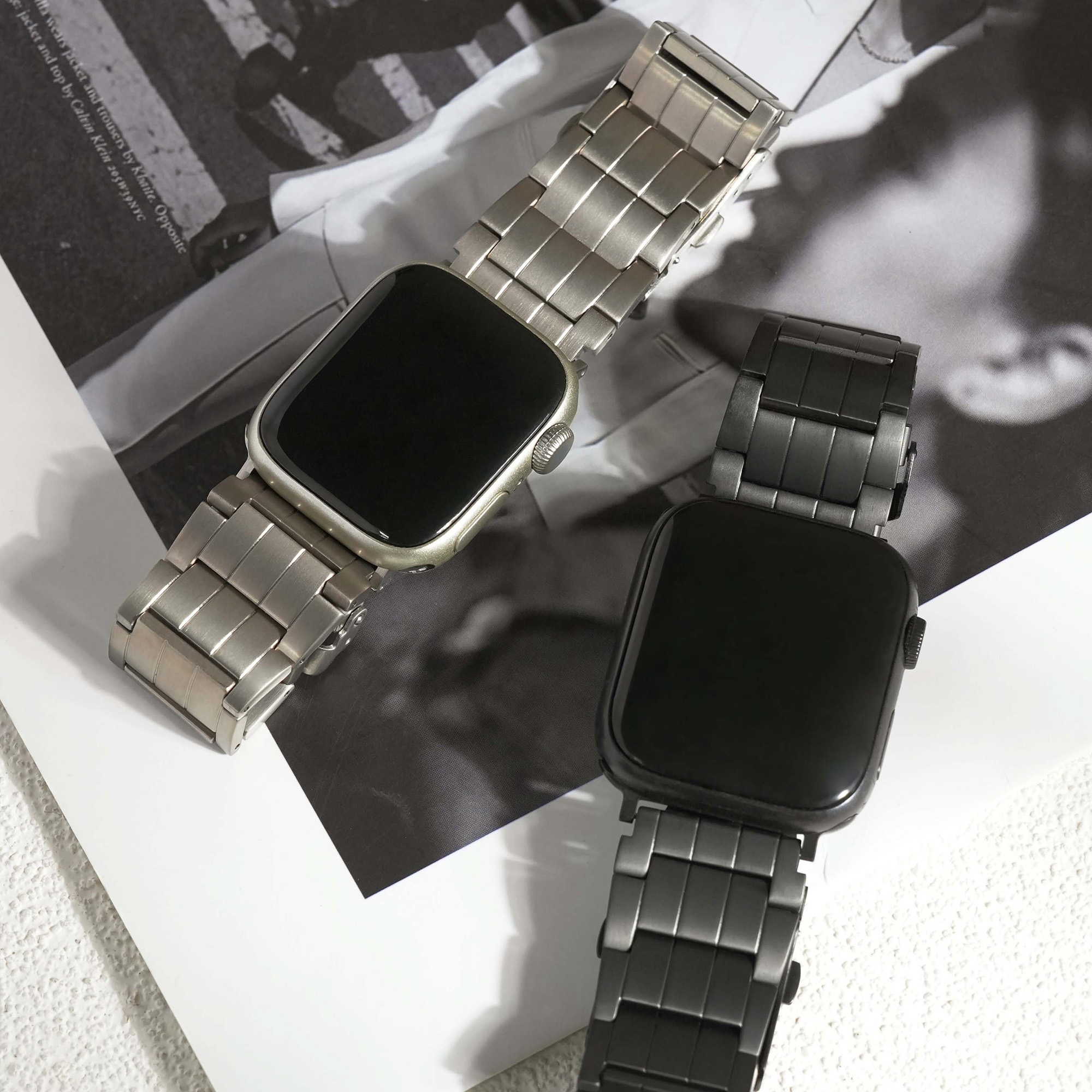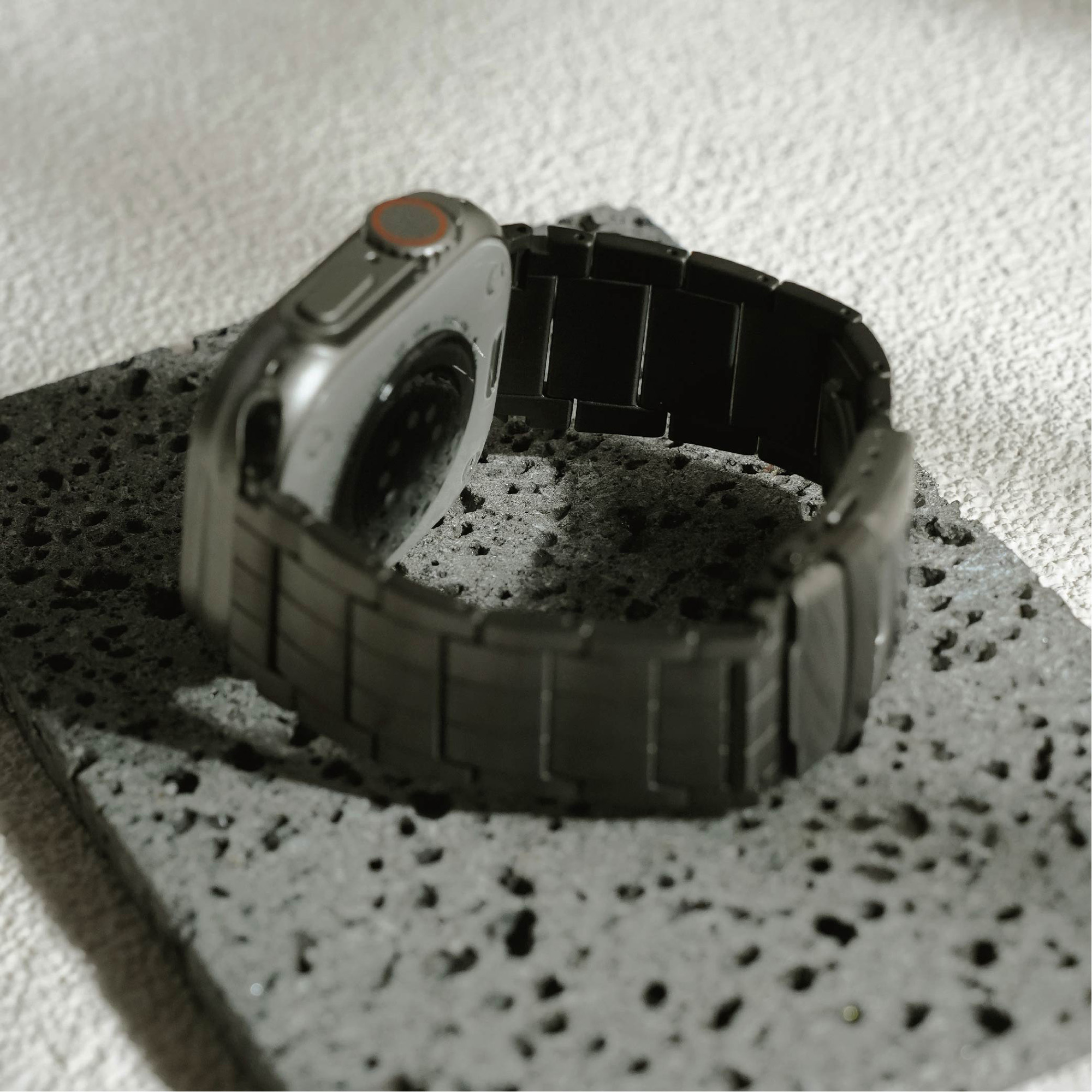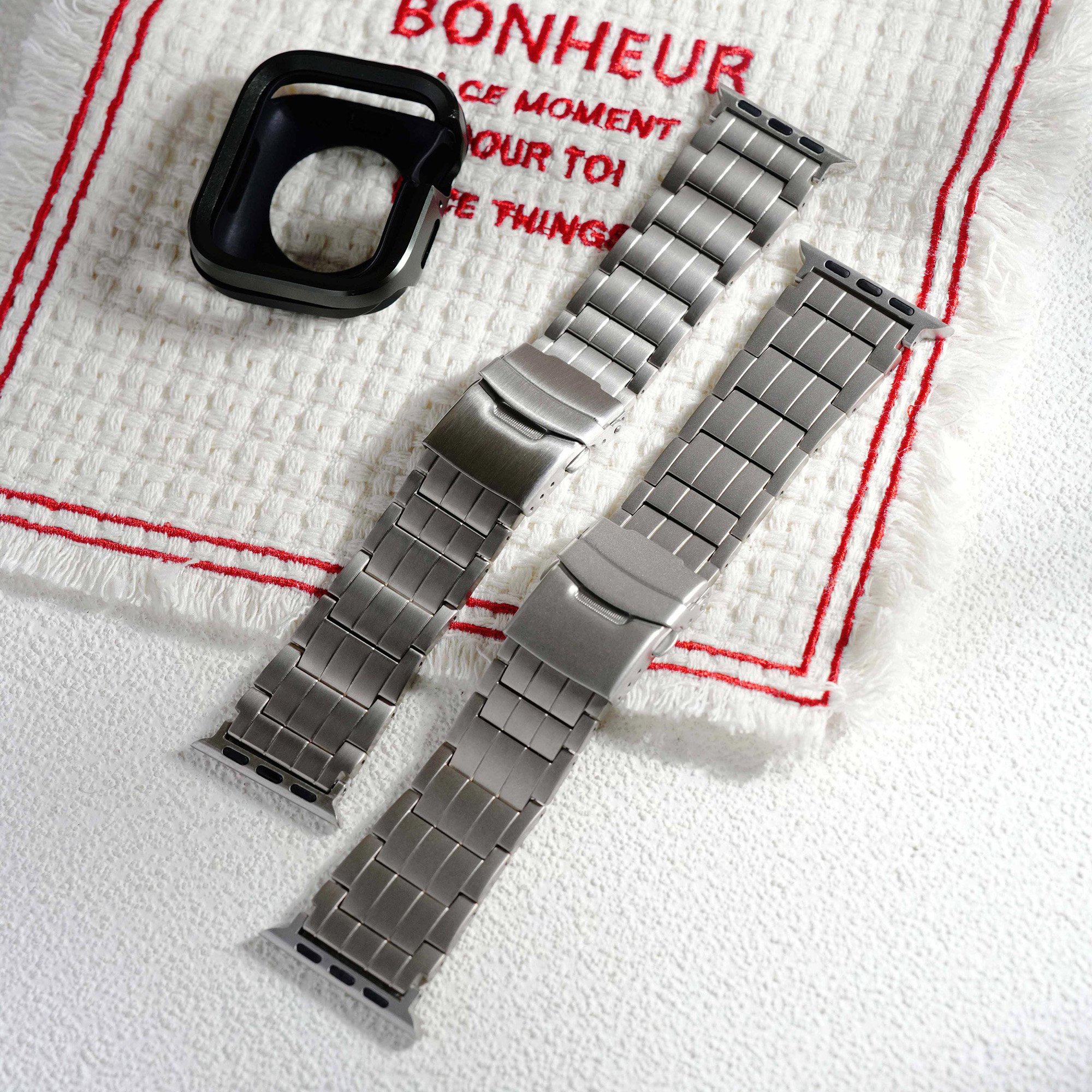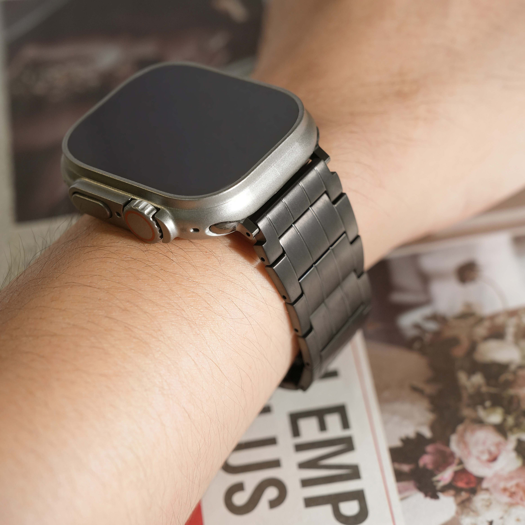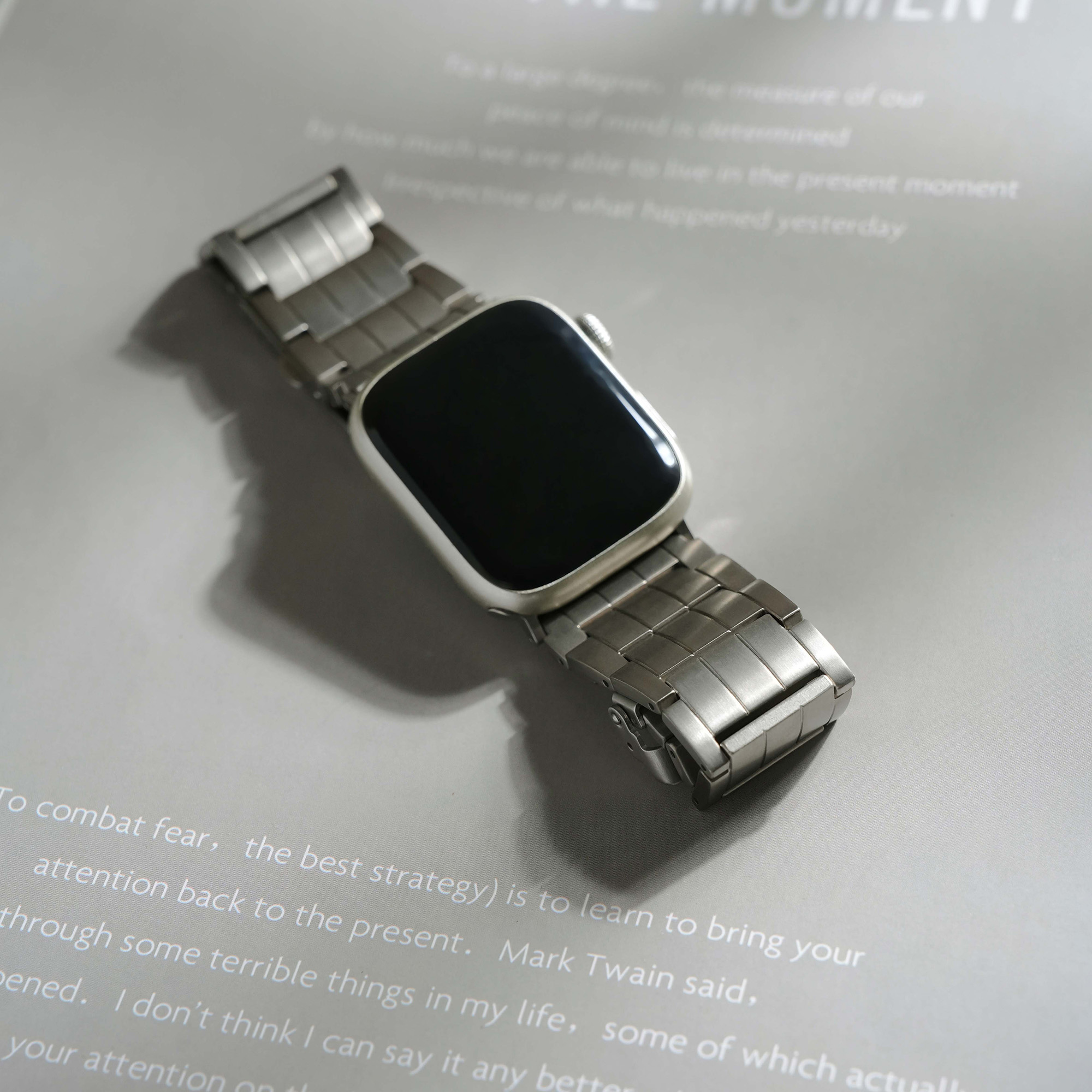 選用高級鈦金屬材質打造,這款錶帶不僅展現俐落硬朗的質感,更兼具輕盈與耐用特性。微霧光澤更增添質感,為你的 Apple Watch 增添奢華與科技兼具的風格。
