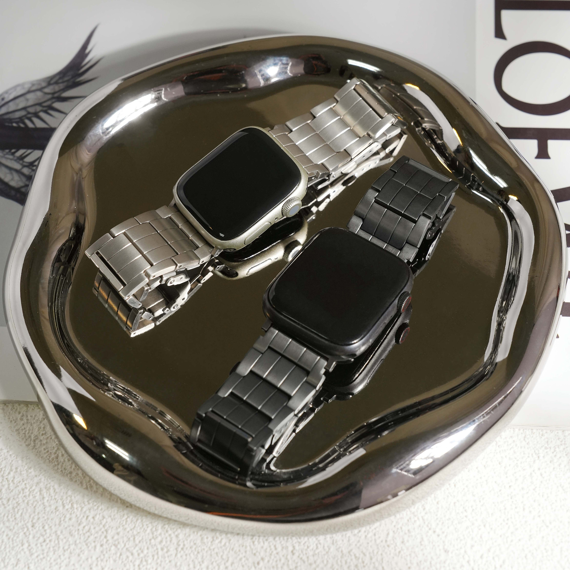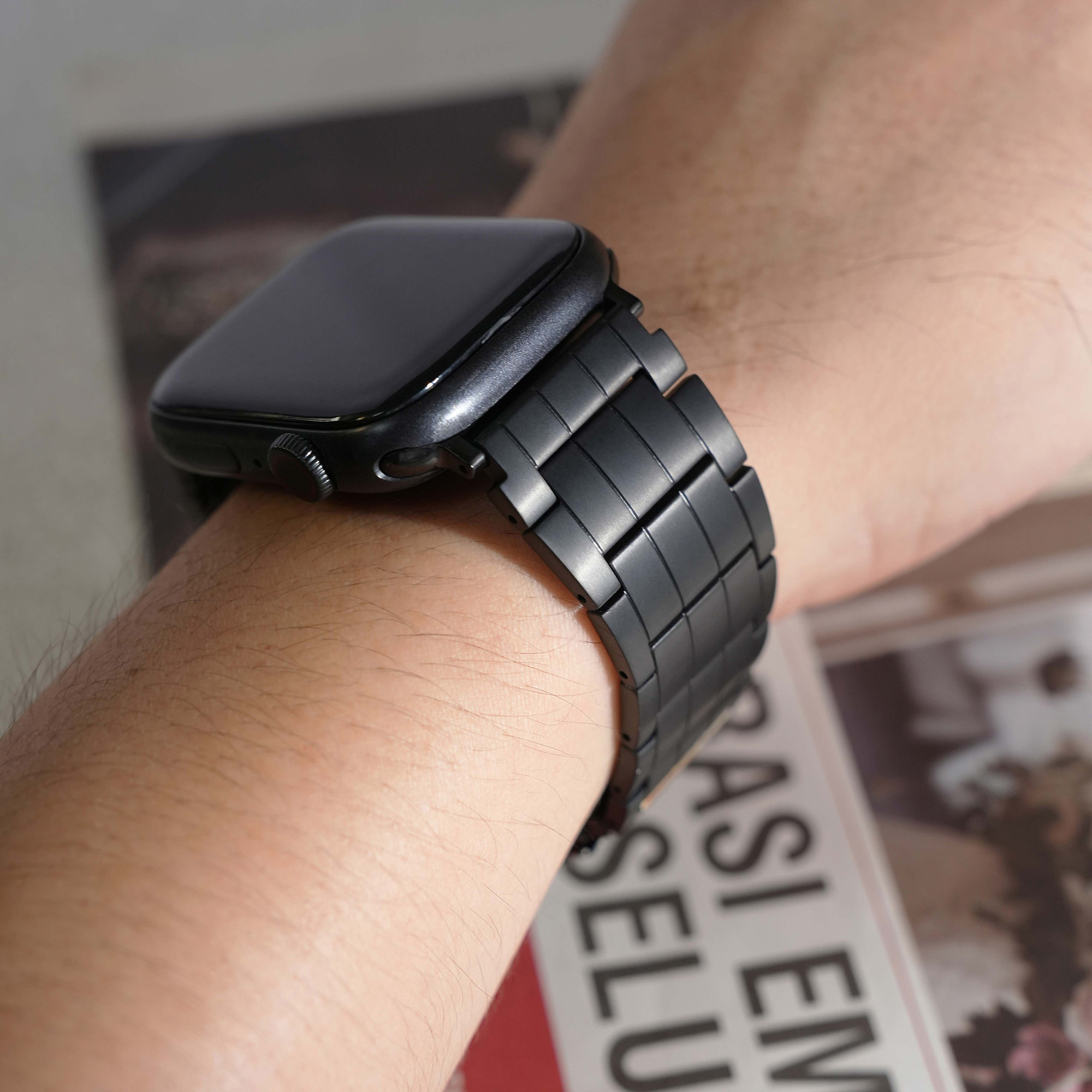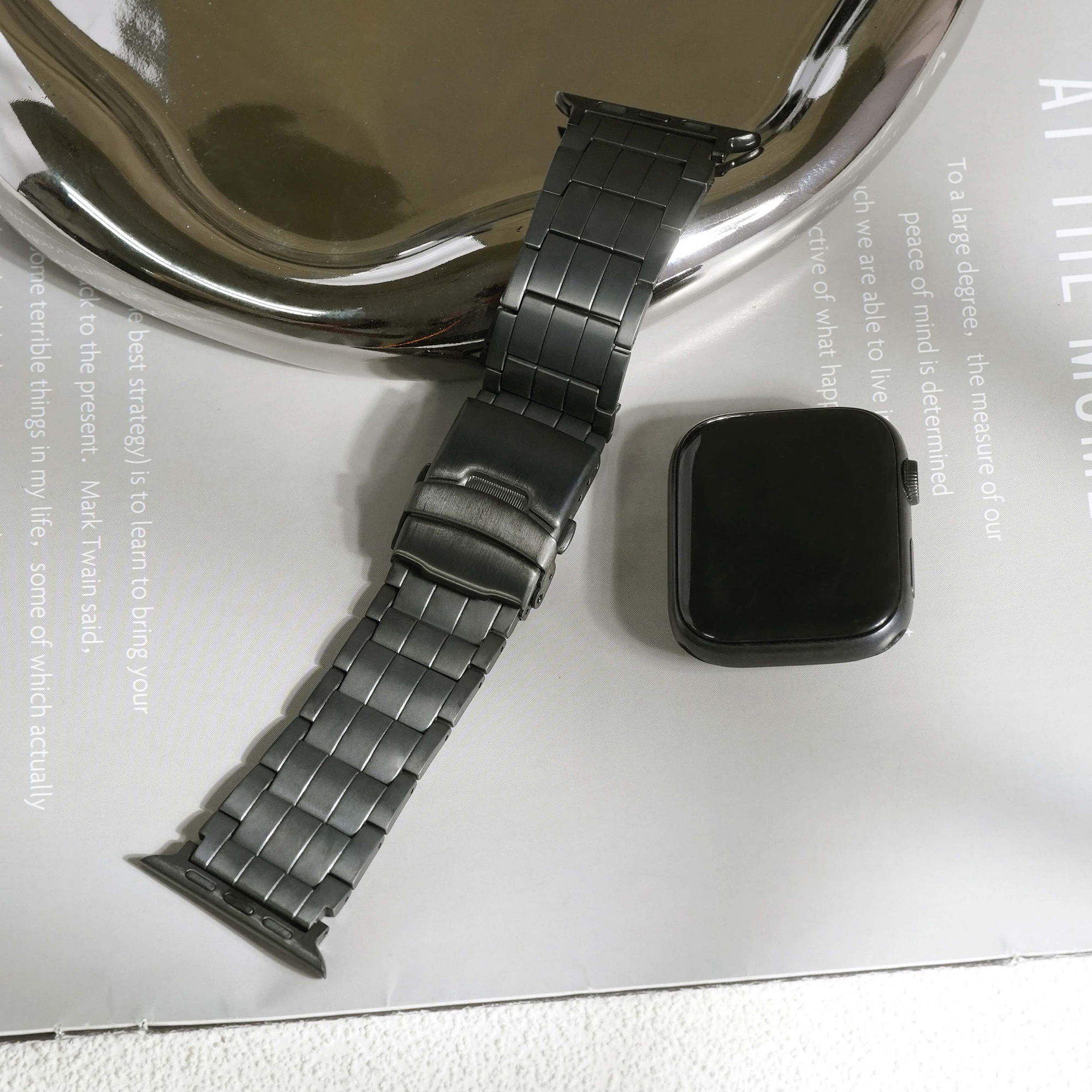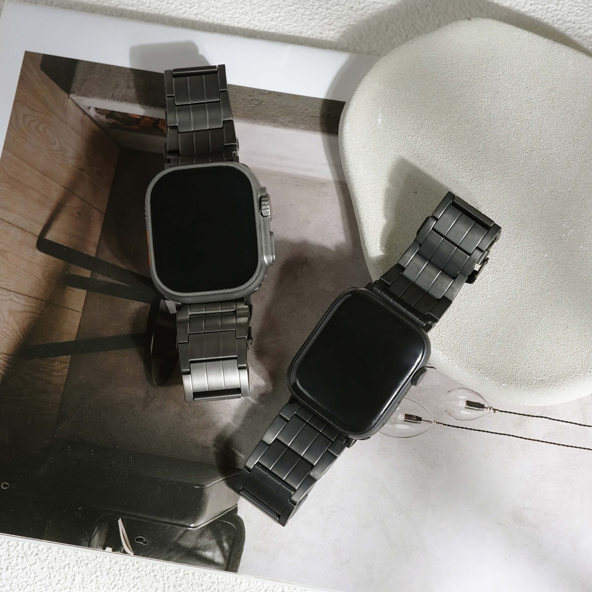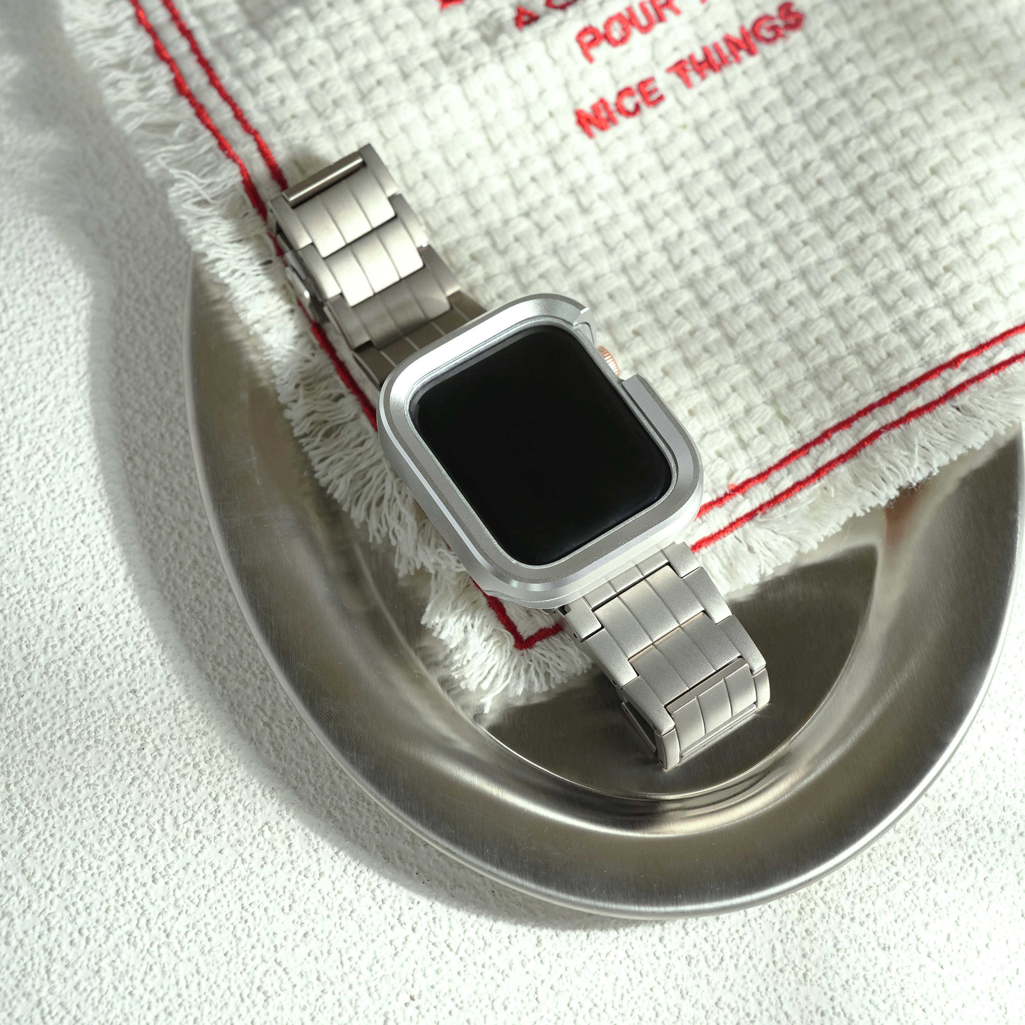 選用高級鈦金屬材質打造,這款錶帶不僅展現俐落硬朗的質感,更兼具輕盈與耐用特性。微霧光澤更增添質感,為你的 Apple Watch 增添奢華與科技兼具的風格。